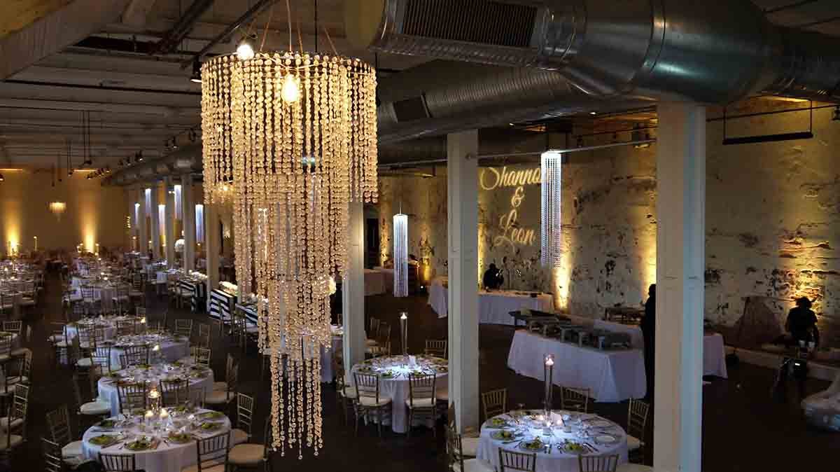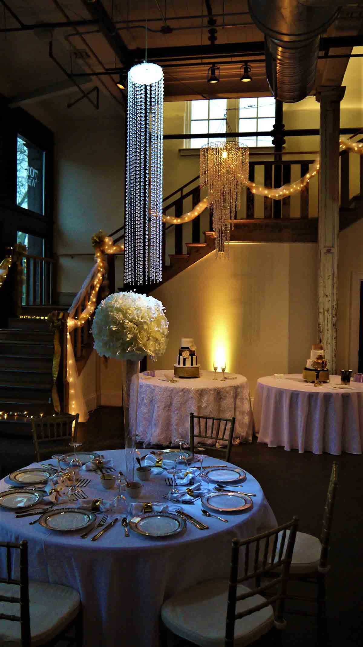 4′ Crystal Chandeliers with lighting. hanging between columns.