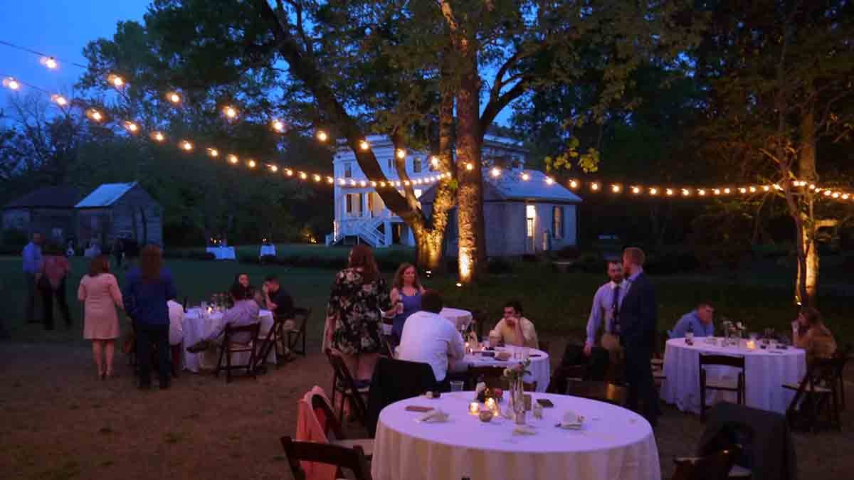 Cafe Style Stringers strung from eave of greenhouse to tree in front