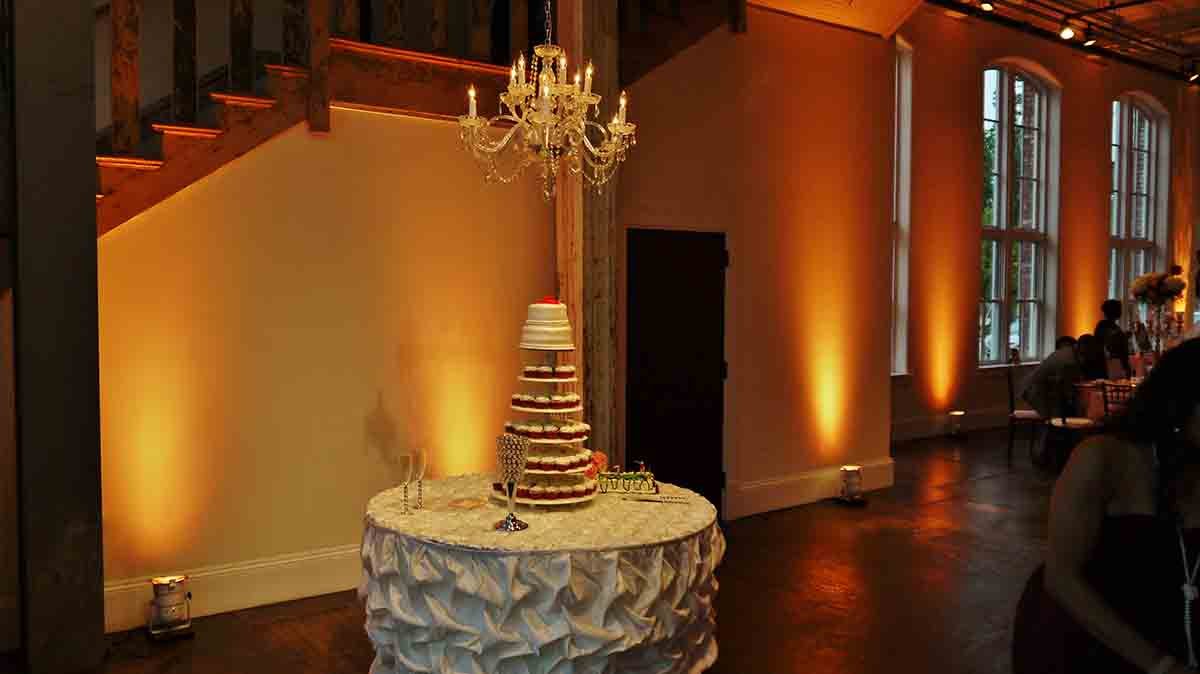 Spotlighting for the cake, sweetheart table, Photo Op area, and 2 large florals