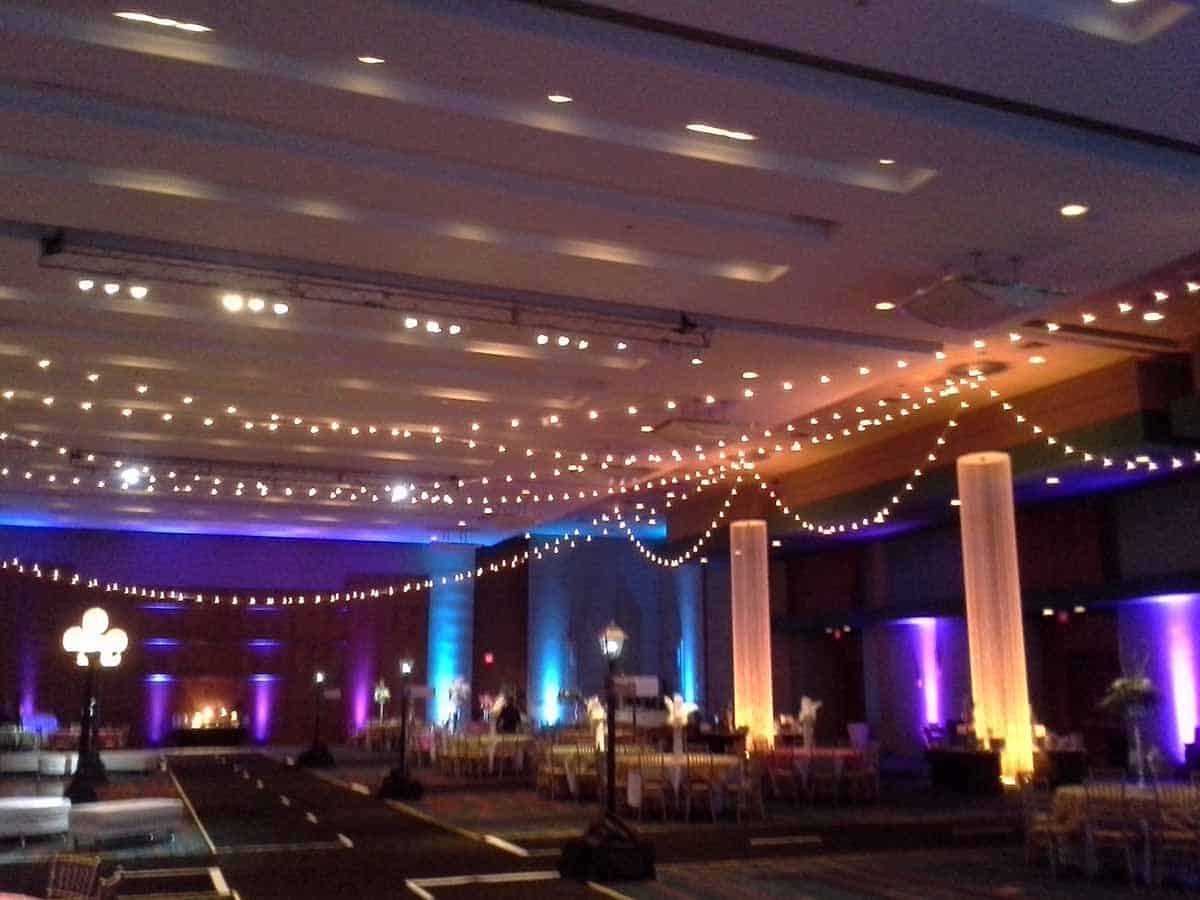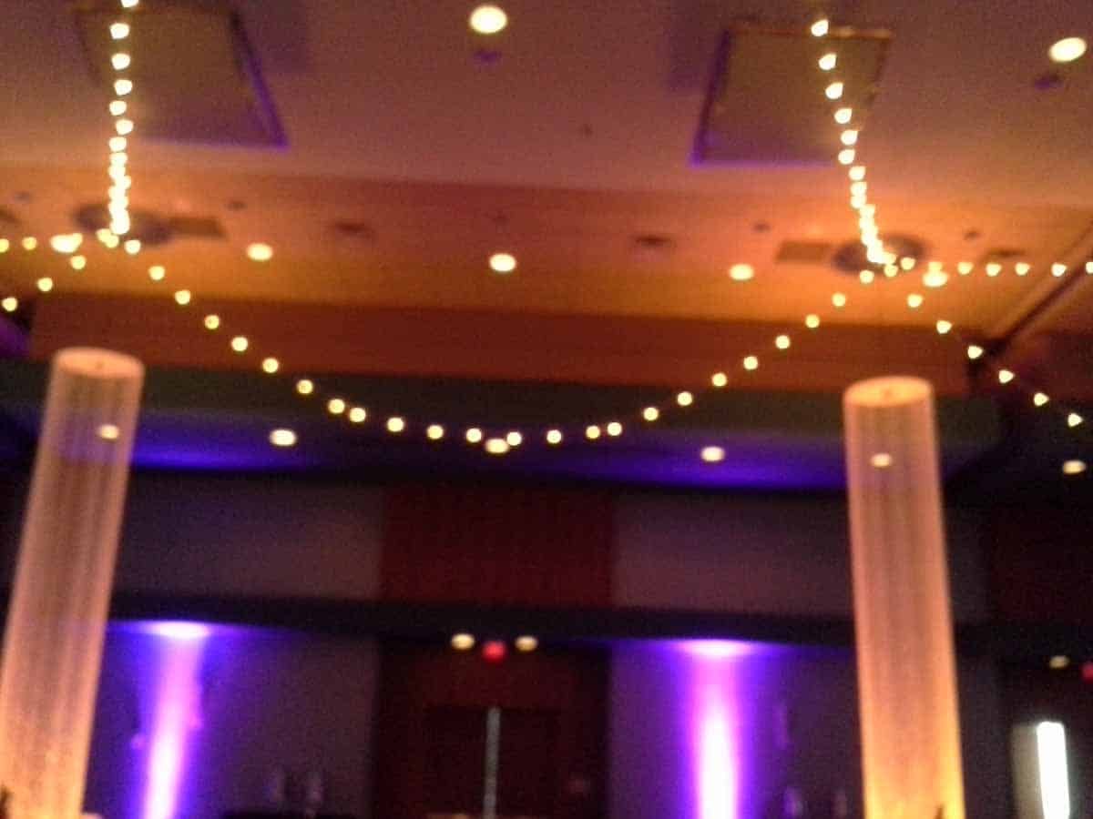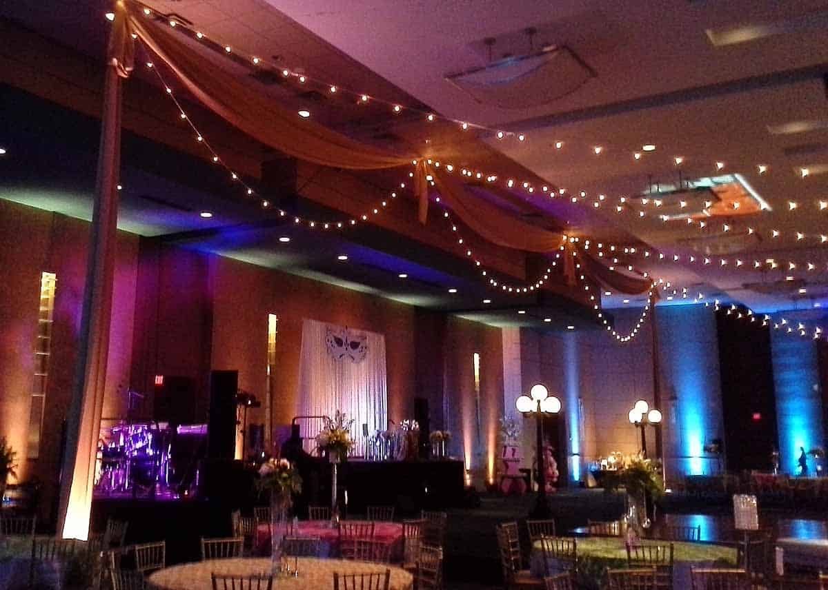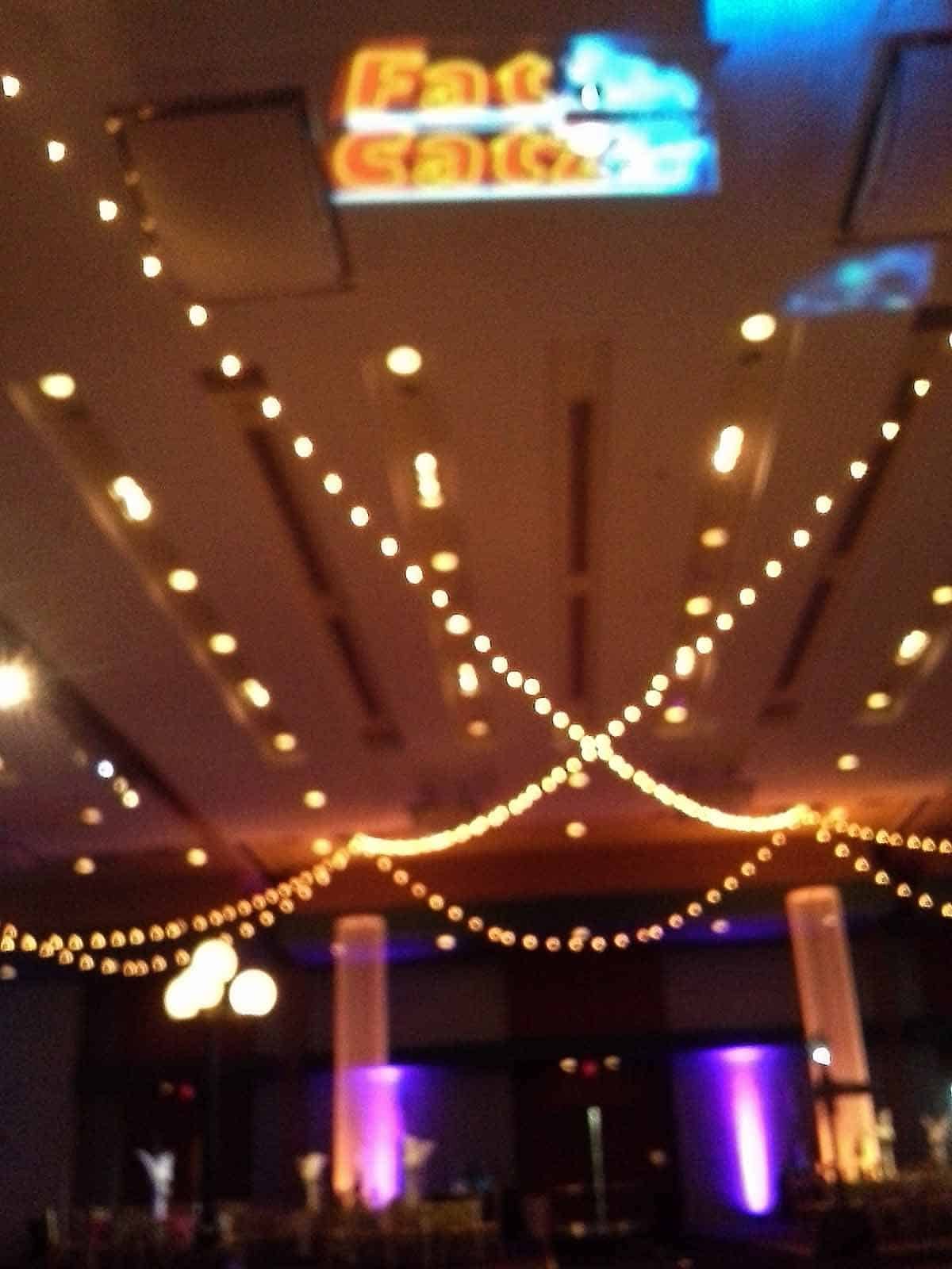 Cafe Style Stringers swagged throughout ceiling (70′ w/ dim control)