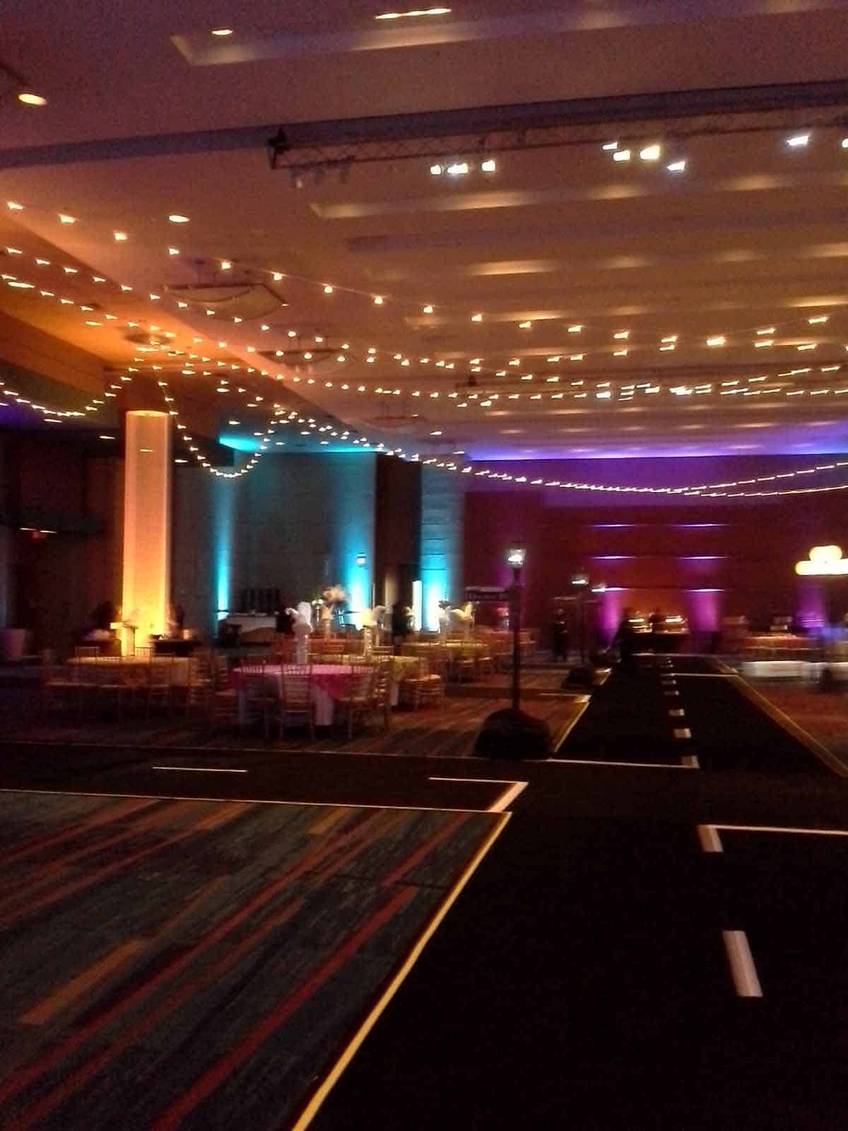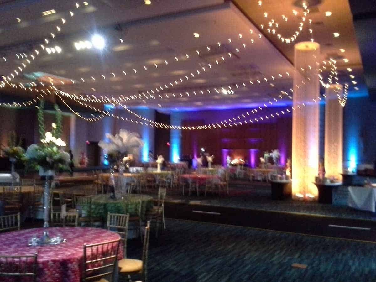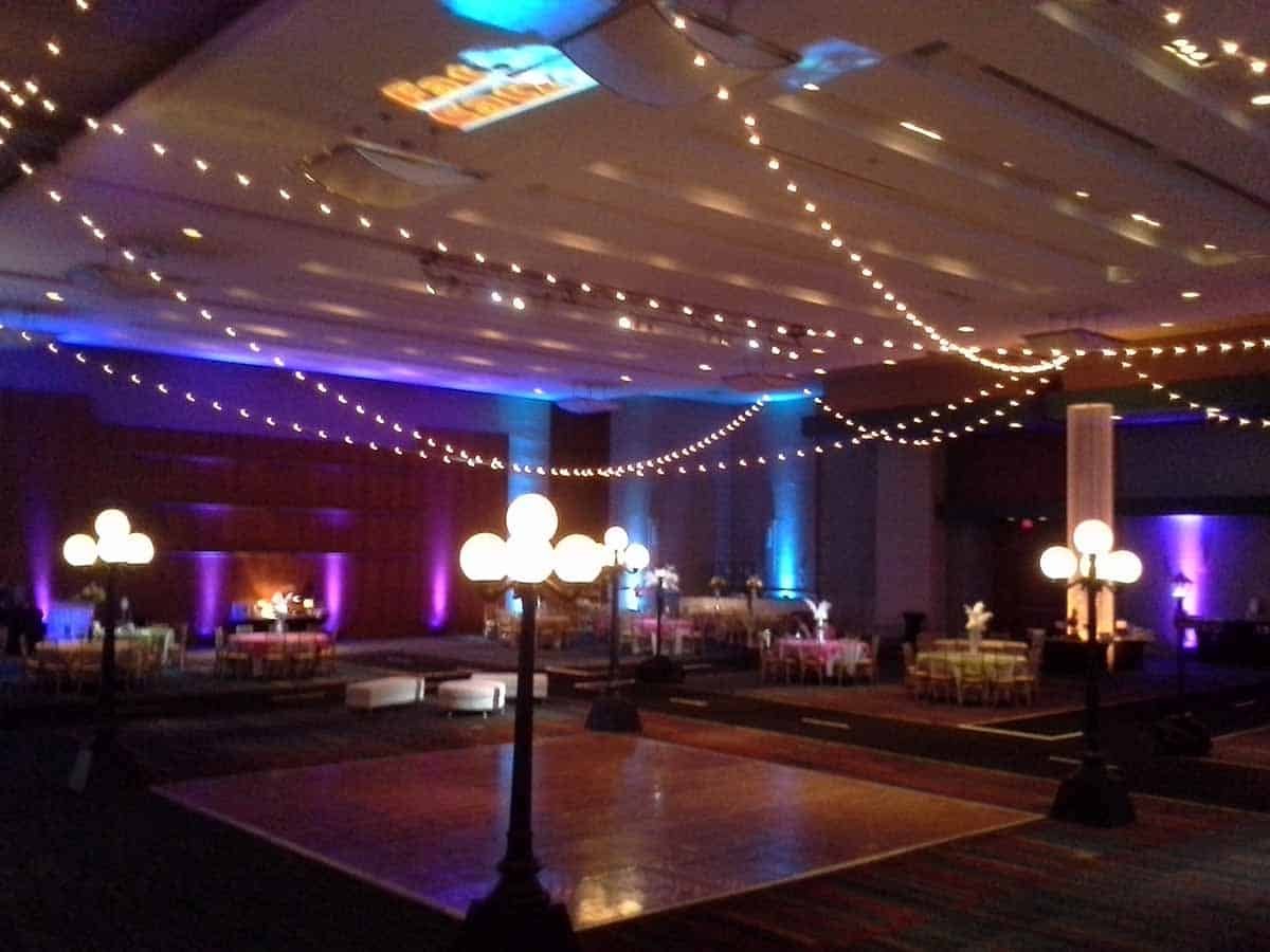 Cafe Style Stringers swagged throughout ceiling (70′ w/ dim control)