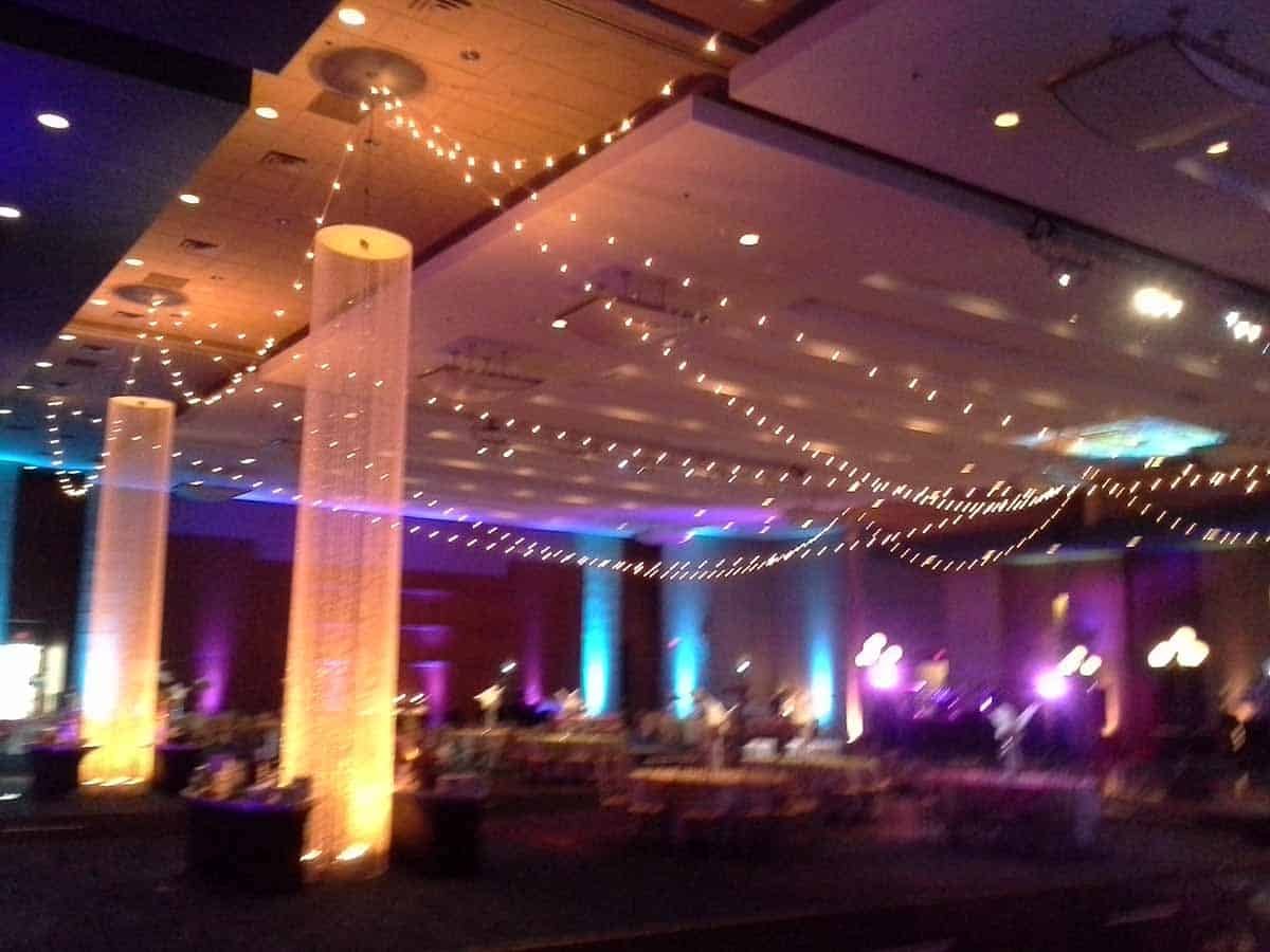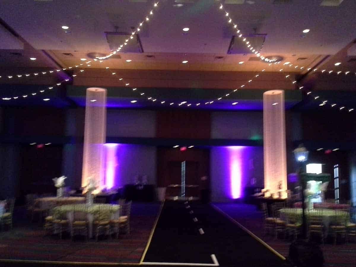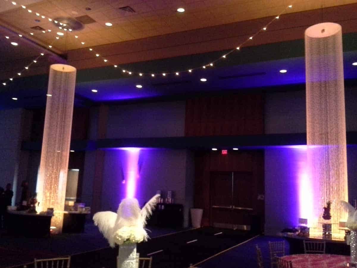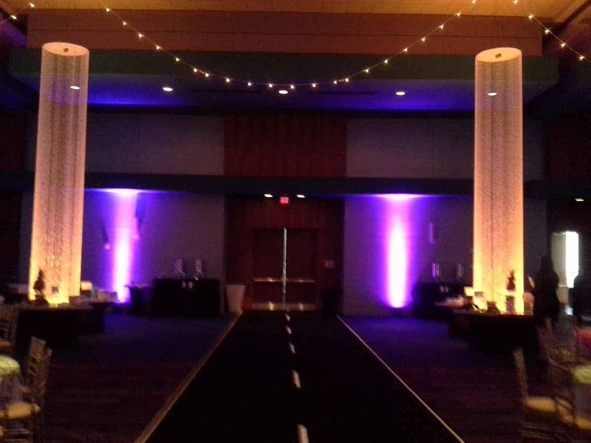 Crystal Columns (20′ x 3′) rotating w/uplighting at center entrance to reception