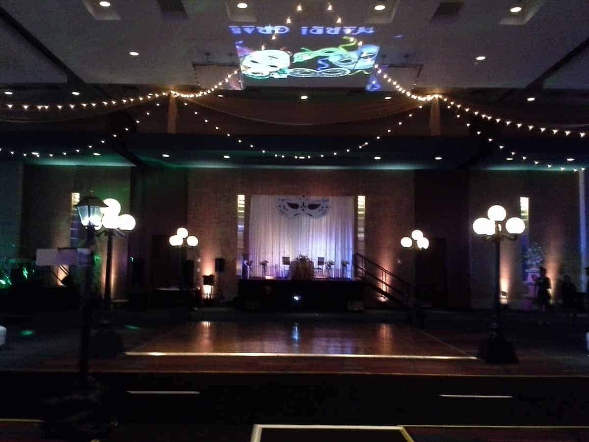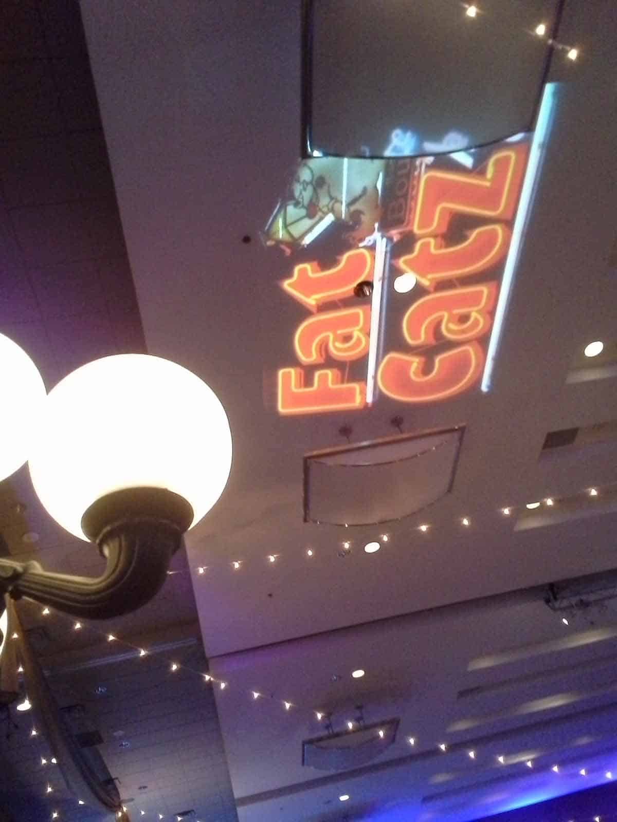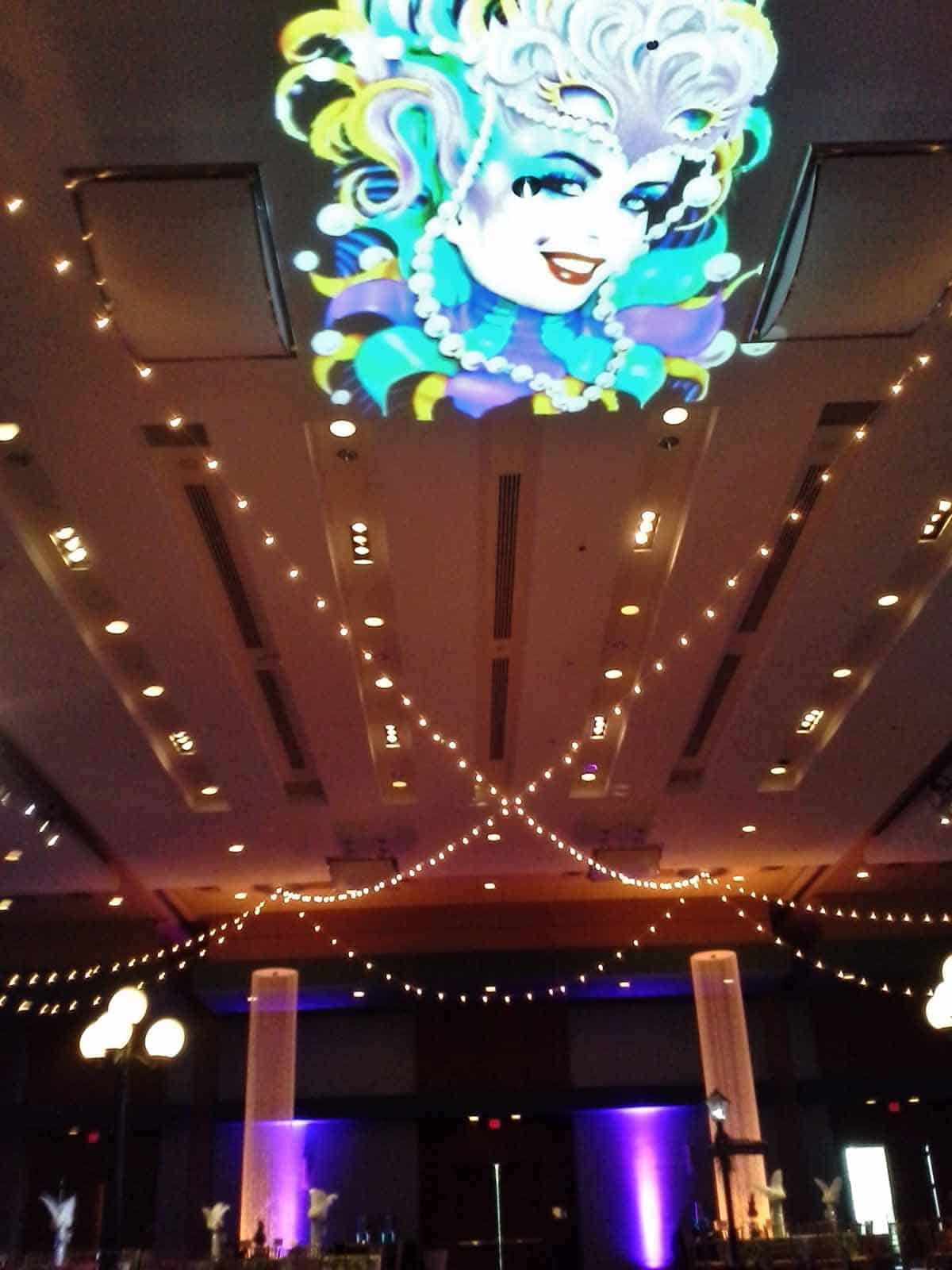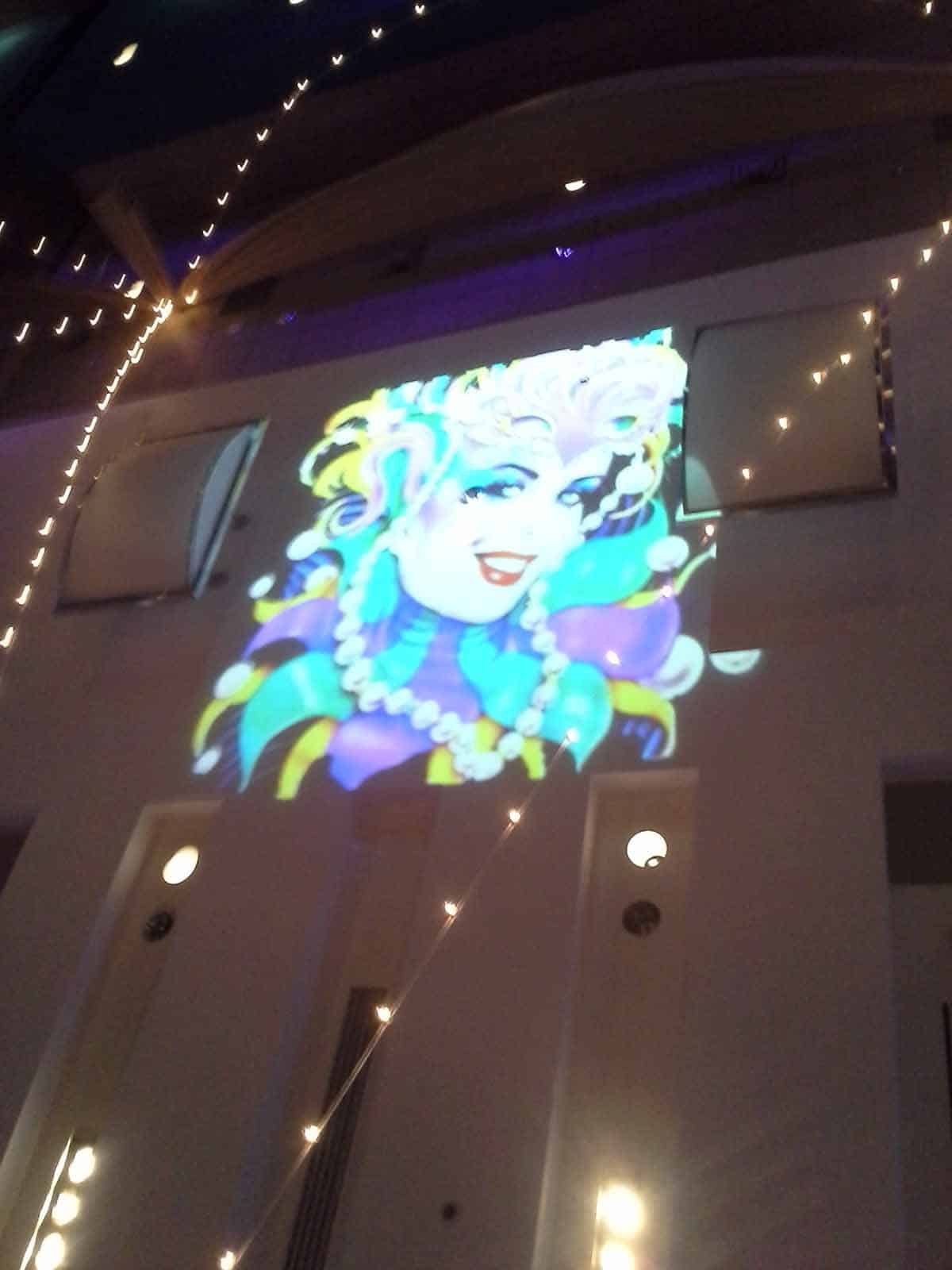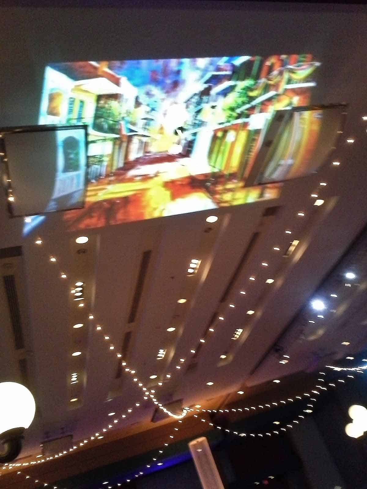 Video images projected onto the white ceiling above dance floor (Pink Cancer Ribbon, Fat Catz sign, Bourbon Street images, etc.