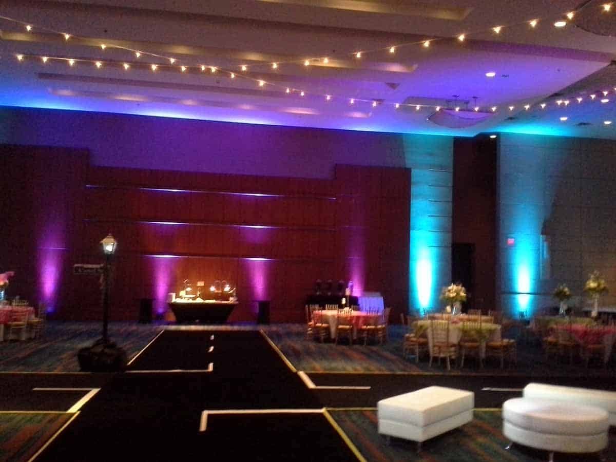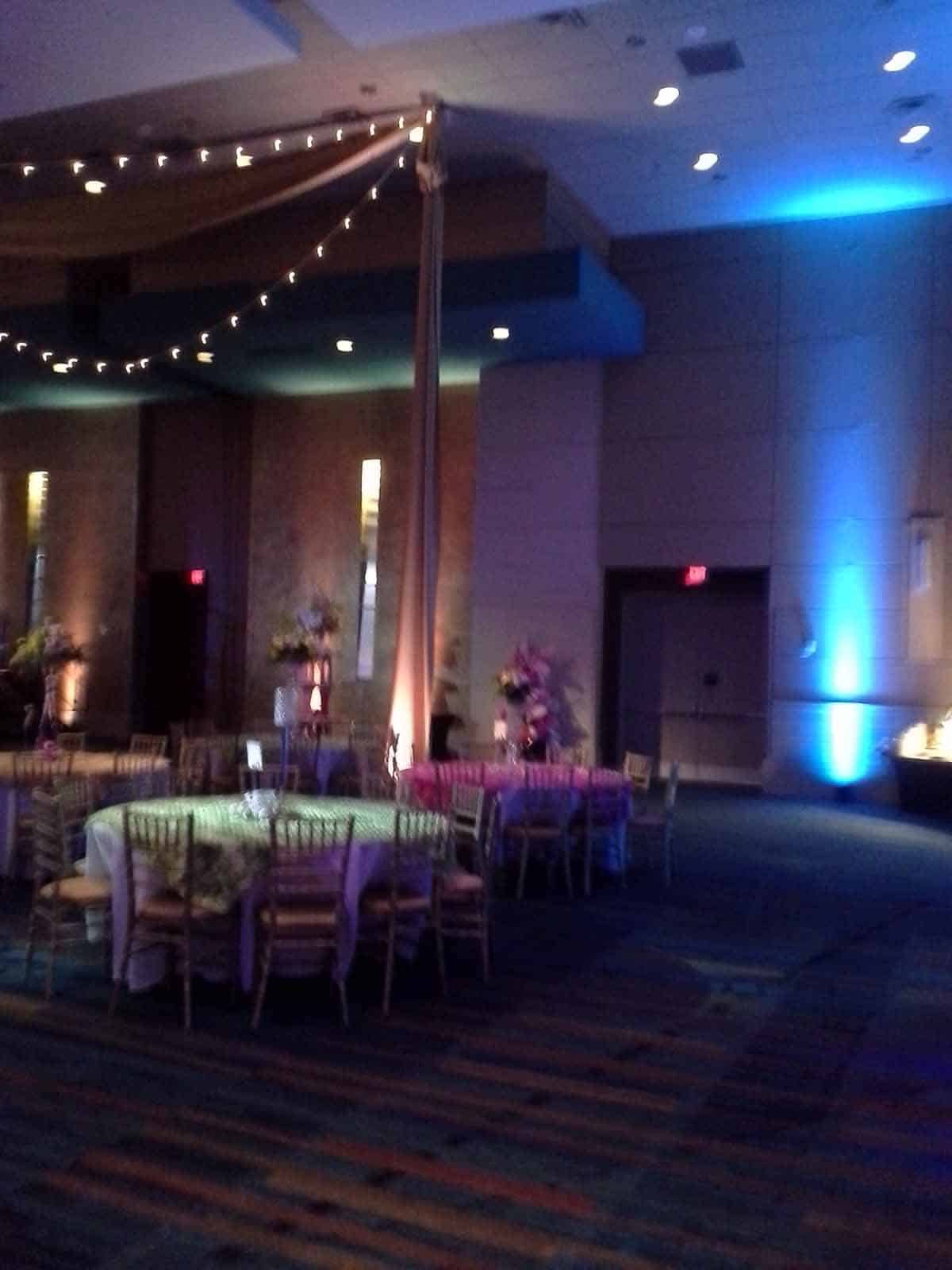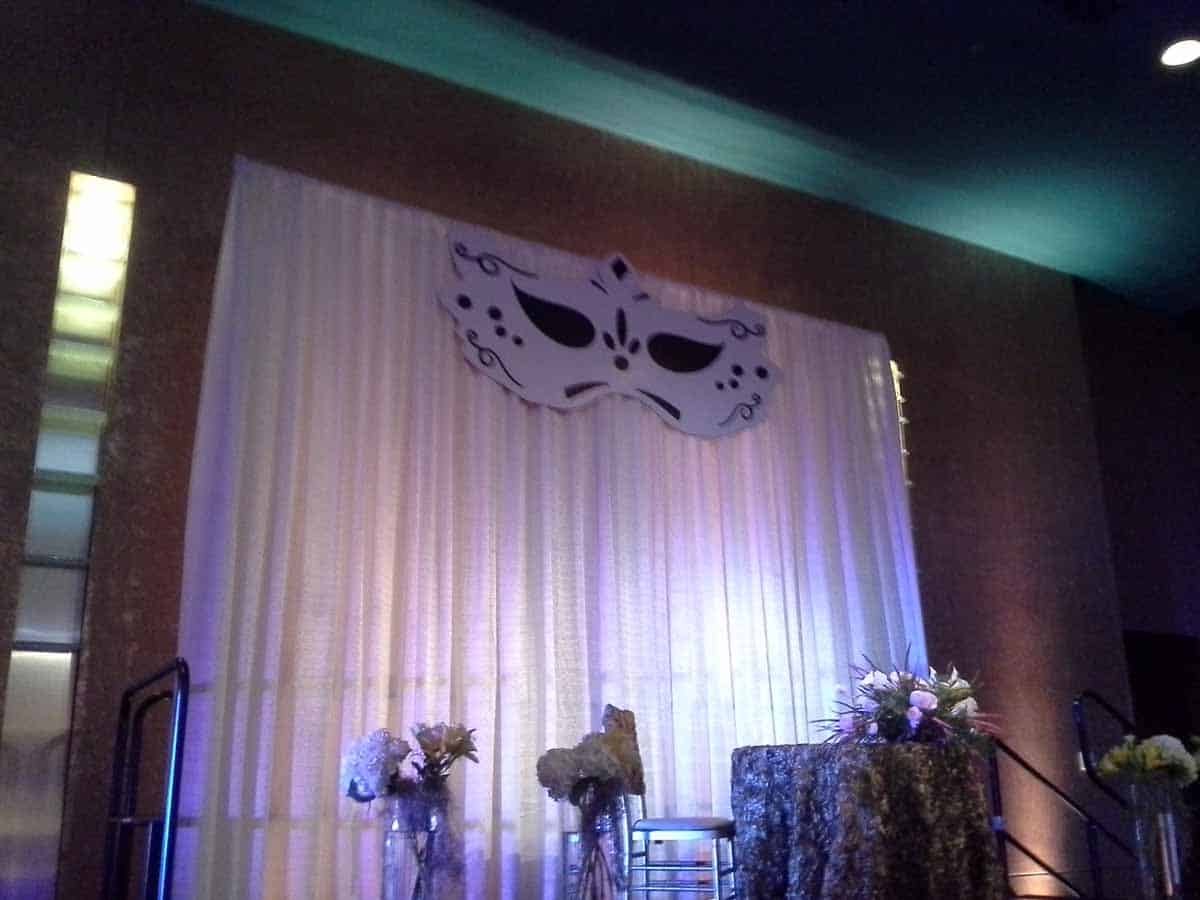 White Sateen Drape w/ uplighting for entrance, 14′ tall