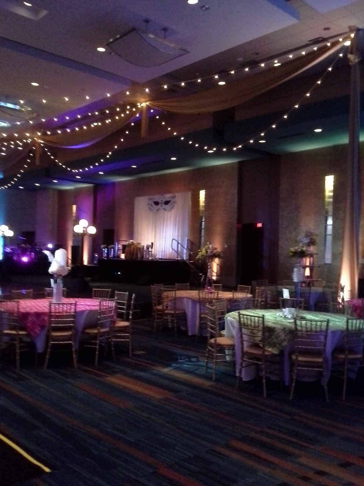 Fabric swag with cafe style lights above head table (100′ Champagne Mystique satin, 100′ w/dim control)