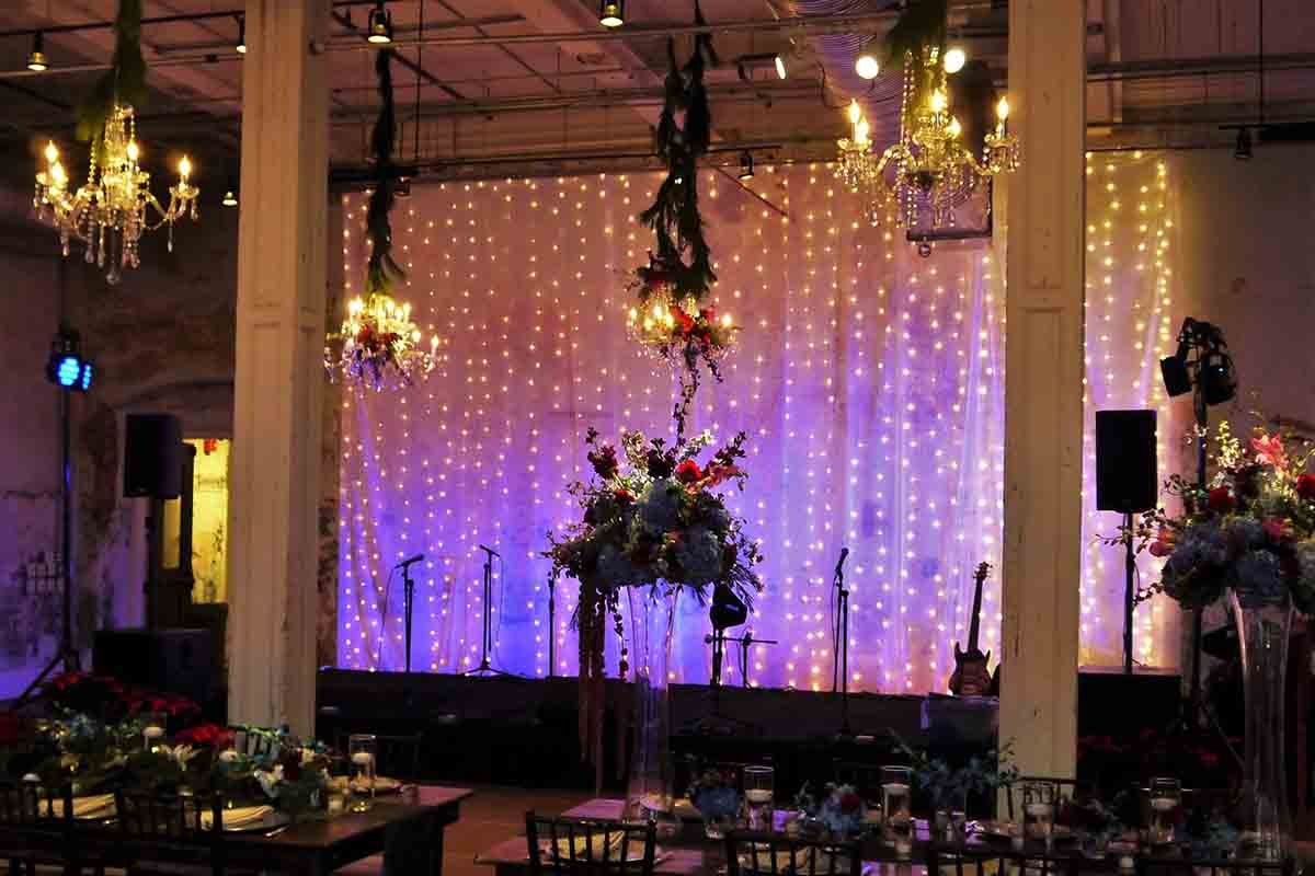 1 Sheer Drape with mini-sting lights behind band (24′ x 12′) – with dimming control