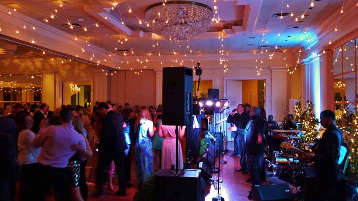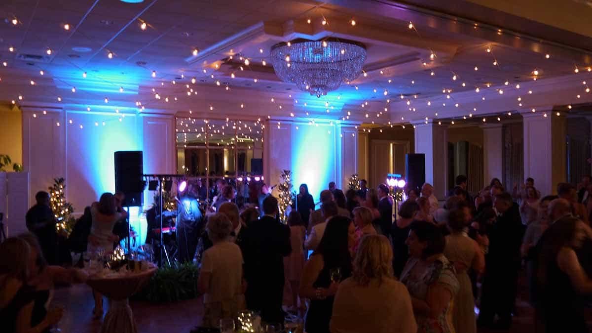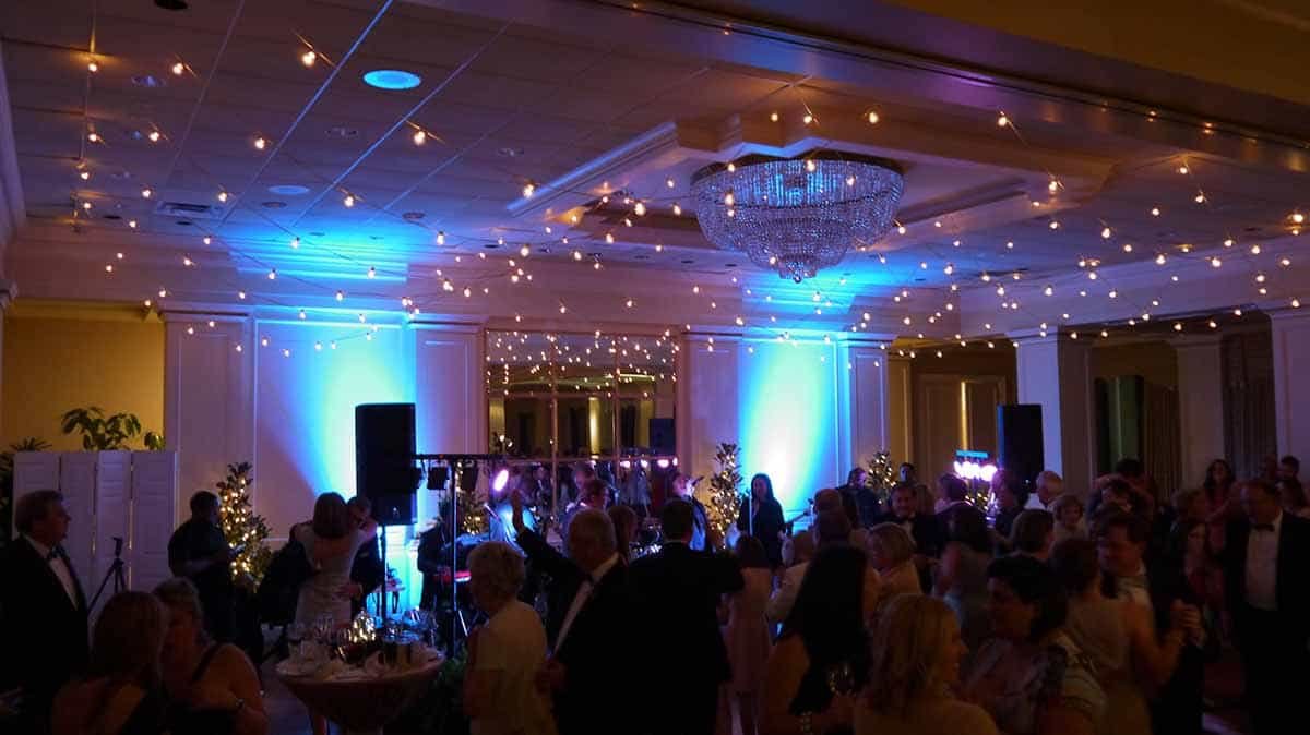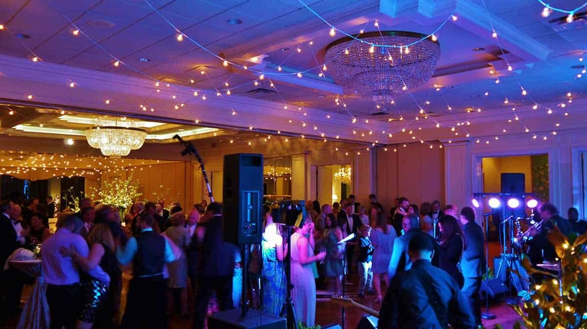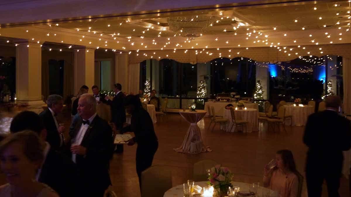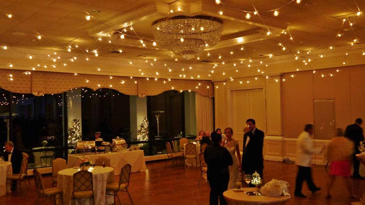 - Cafe Style Stringers above Band section of room, with dimming white C7 lamps, and running L<>R, repeating
