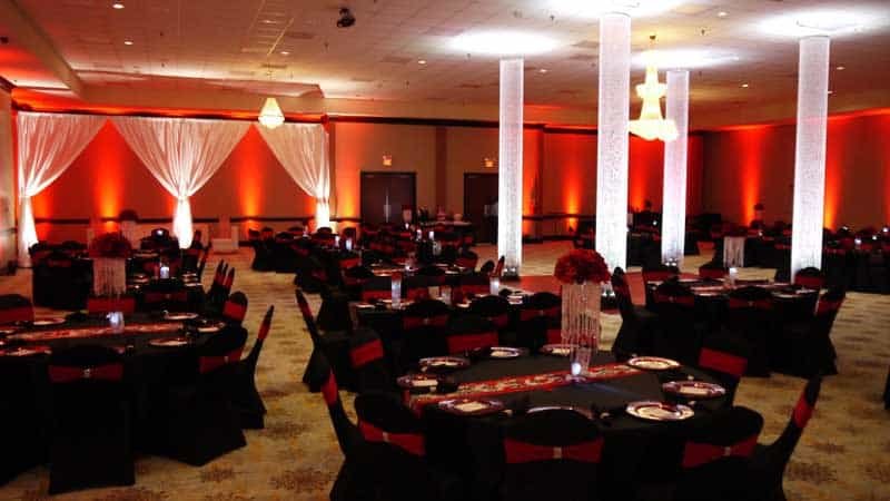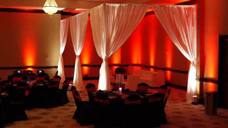 We provided custom lighting and drape for the ceremony and reception. Some of the elements included uplighting, backdrops for the altar and head table, crystal columns, and pattern projections.