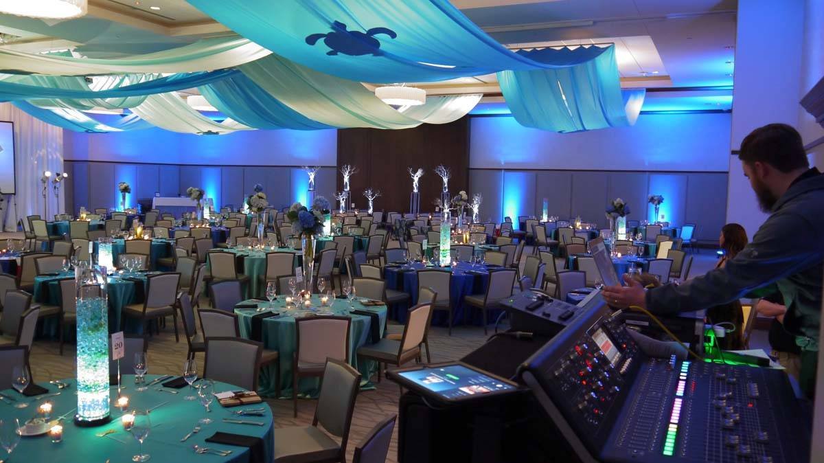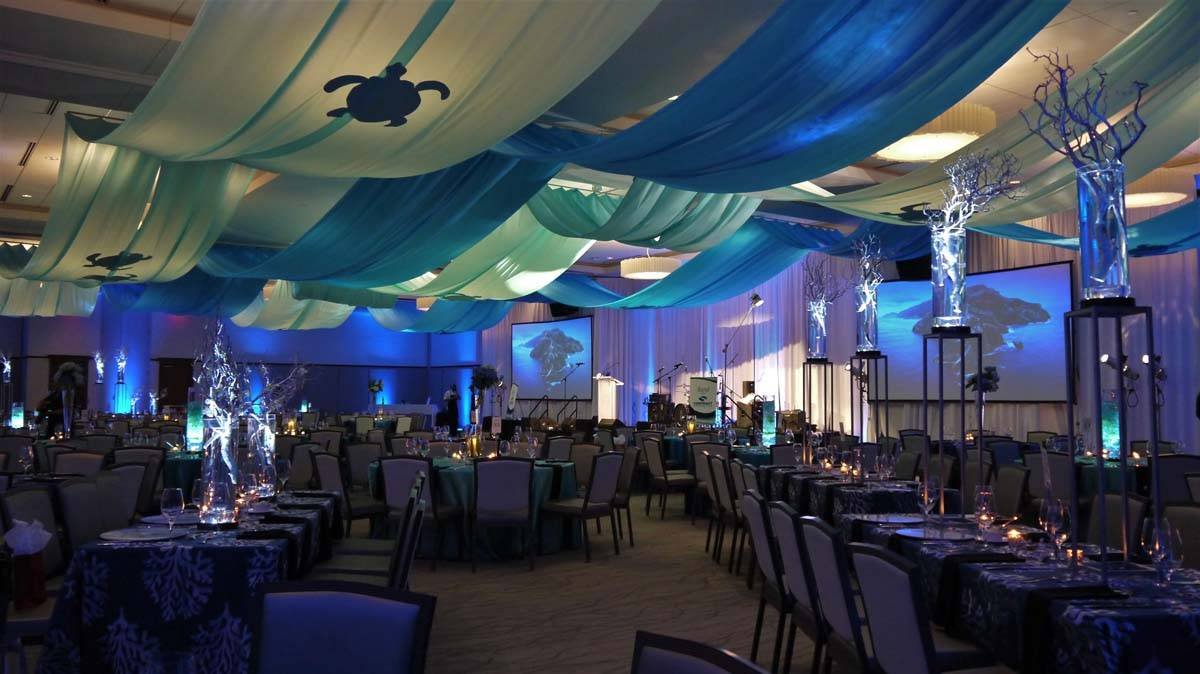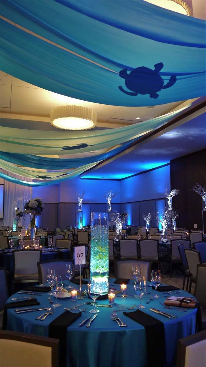 This year’s theme was “Under the Sea” and it was beautifully designed by the creative minds at Cricket Newman Designs who had the idea to cover the ceiling with fabric “waves” and use lighting to create the perfect atmosphere.